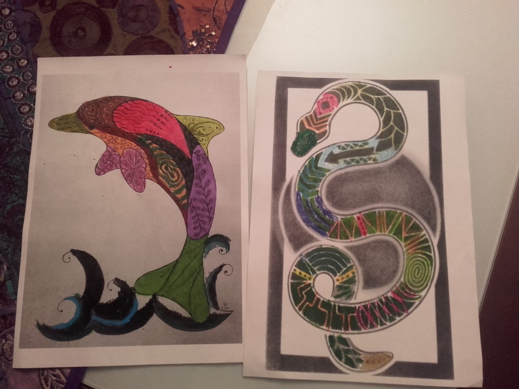 Here, I’m working with my 6-year-old son, coloring some totem animals I wanted to bring to the dance: wolf, fox, dolphin, deer, owl, snake and butterfly. My son chose a dolphin to colour first; I did a fox (shapeshifter, of course!). Then my son selected a snake: yes! Very proud!